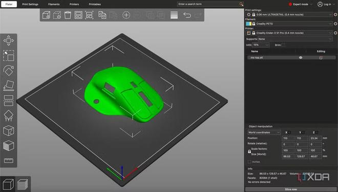 需要注意的是,由于家庭 3D 打印机无法还原原版鼠标外壳材质,成品的表面手感会“略显粗糙”。因此该博主建议选用PETG或ABS材料,相应材料硬度高、耐用性强,适合日常携带使用。