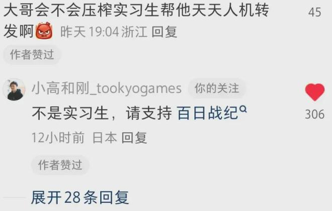 小高和刚:最开始我是有点吃惊的,心想“这是怎么回事啊”,不过后来我能感受到大家都在享受着这种玩法。而且很多恶搞账号也在用心地帮忙宣传《百日战纪》,所以对我来说,也希望大家把这些也都当成乐趣的一部分,一起玩得开心。而且能有这么多人帮我宣传游戏,真的让我觉得很受鼓舞,很感激。