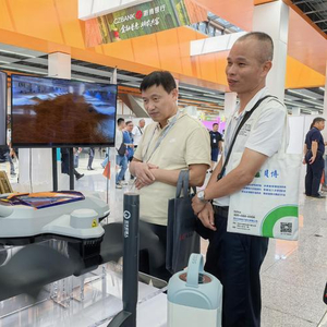 展台前的平仓机器人吸引了不少客商驻足。新华社记者武江民 摄