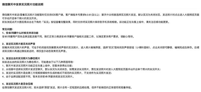据腾讯客服消息,微信日前开启「聊天中发送/查看实况照片」功能灰测,暂时仅支持 iOS 客户端(版本号要求 8.0.61 及以上)。