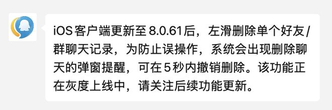 客服介绍,在用户左滑删除单个好友/群聊天记录时,为防止误操作,系统会出现删除聊天的弹窗提醒,可在 5 秒内撤销删除。