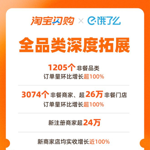 同时,淘宝闪购订单结构向全品类拓展:在非餐方面,1205个品类订单量环比增速超过100%;3074个商家、超26万门店订单量环比增长超100%。其中,粮油米面订单增长335%,家庭清洁增长324%,休闲食品增长312%,玩具潮玩增长225%,3C数码增长129%,美妆个护、服饰运动、家用电器、母婴等品类的增幅也均超过100%。