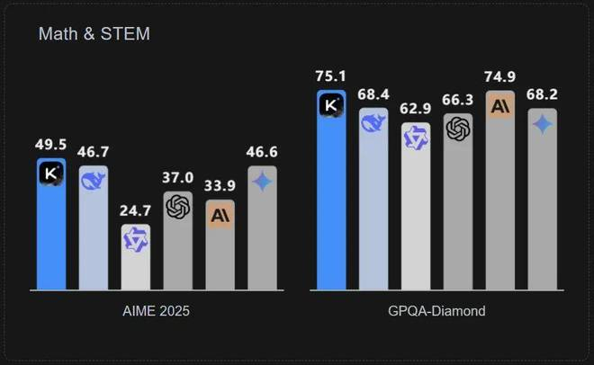 从 LiveCode Bench、AIME2025 和 GPQA-Diamond 等多个基准测试成绩来看,此次 Kimi K2 超过了 DeepSeek-V3-0324、Qwen3-235B-A22B 等开源模型,成为开源模型新 SOTA;同时在多项性能指标上也能赶超 GPT-4.1、Claude 4 Opus 等闭源模型,显示出其领先的知识、数学推理与代码能力。