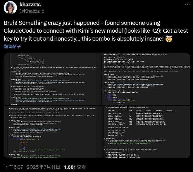 网友使用 Claude Code 链接 Kimi K2,发现效果不错。