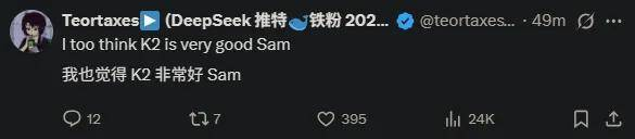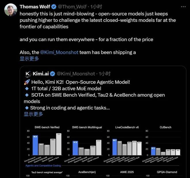 HuggingFace 联合创始人 Thomas Wolf 也表示,K2 令人难以置信,开源模型正在挑战最新的闭源权重模型。