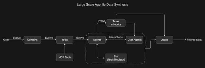 接下来,这些智能体与模拟环境、用户智能体进行交互,创造出逼真的多轮工具使用情景。最后,由一个大语言模型(LLM)充当评判员,根据任务评分标准(rubrics)评估模拟结果,筛选出高质量的训练数据。