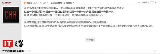IT之家 7 月 14 日消息,Chiphell 论坛站长 nApoleon 昨日上午表示,英特尔将于今年四季度推出 Arrow Lake-S Refresh 处理器,“并不是单纯提频换名, 制程步进也将是新的工艺”。