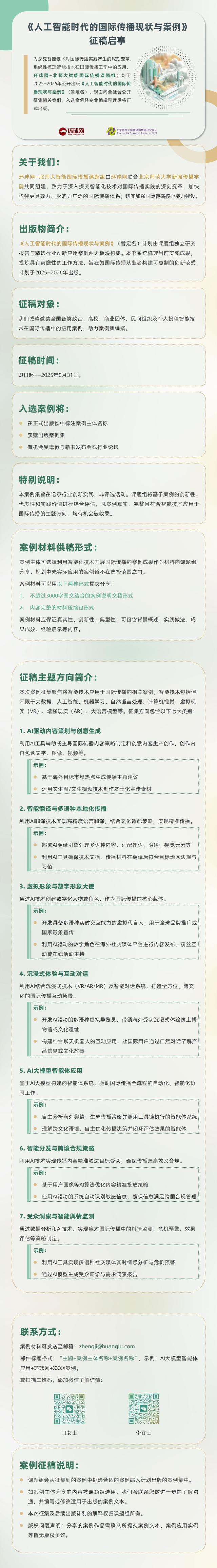 为探究智能技术对国际传播实践产生的深刻变革,系统性梳理智能技术在国际传播工作中的应用,环球网—北师大智能国际传播课题组计划于2025—2026年公开出版《人工智能时代的国际传播现状与案例》(暂定名),现于7月14日面向全社会公开征集相关案例。入选案例经专业编辑整理后将正式出版。