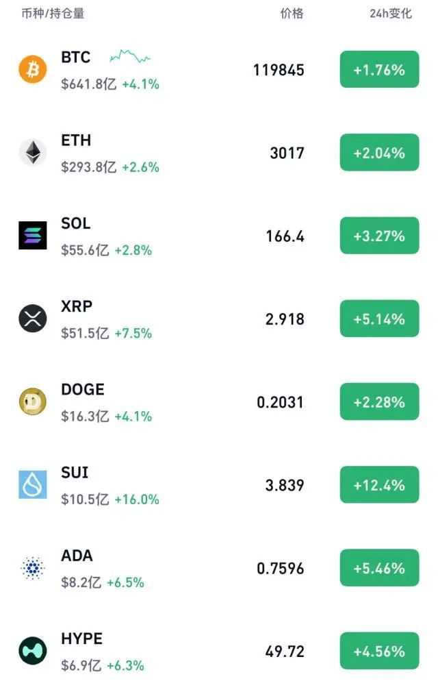 7月14日,除比特币价格大涨外,主流加密货币均出现上涨行情。其中,以太坊当日价格突破3000美元,截至发稿,报3017美元,上涨2.04%;狗狗币报0.2031美元,上涨2.28%;SUI报3.839美元,上涨12.4%;瑞波币报2.918美元,上涨5.14%。