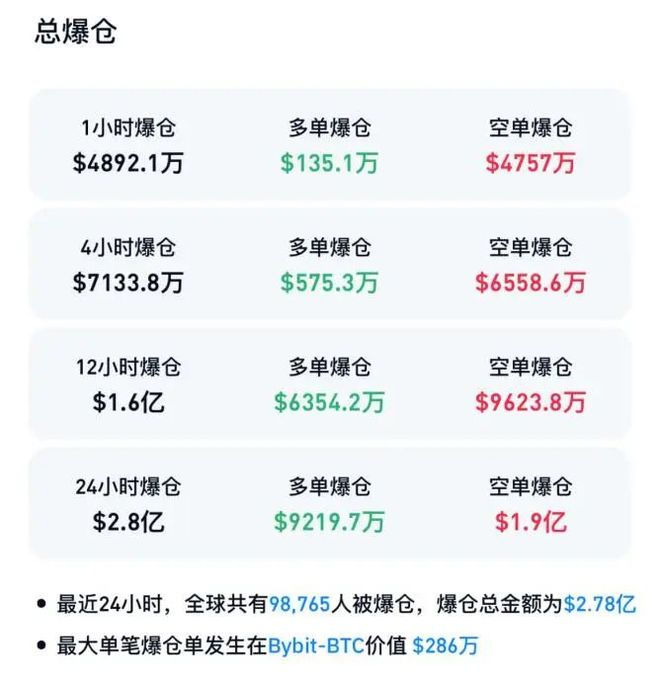 其中,多单爆仓金额达到9219.7万美元,空单爆仓金额达到1.9亿美元。最大单笔爆仓单发生在Bybit-BTC,价值为286万美元。