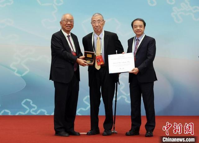 2025年7月13日,国际基础科学大会主席丘成桐(左)和中国科学院院士王贻芳(右)为诺贝尔物理学奖获得者丁肇中颁发2025年度“基础科学终身成就奖”。李国庆摄