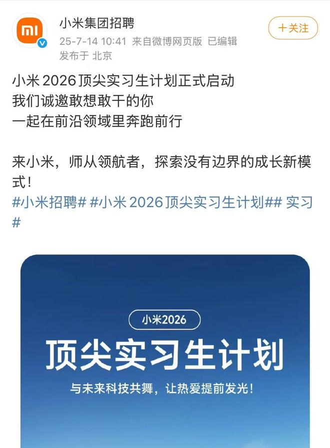 小米启动2026顶尖实习生计划:将参与AI、芯片、具身智能、自动驾驶等项目