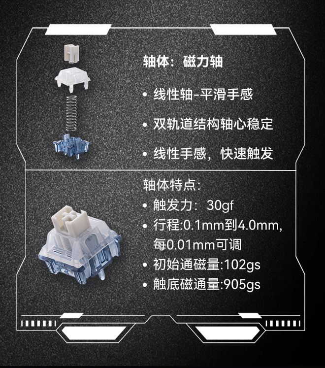 EpomakerHE80 的国行版本搭载一款双轨线性磁轴,触发力度 30gf,支持 0.01mm 步进行程调整。该键盘采用原厂高度 PBT(多数按键) / 透明 PC(Esc、退格、回车、空格)混合键帽。