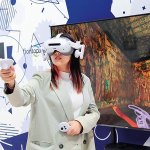 观众在第二十一届中国(深圳)国际文化产业博览交易会上体验VR修复永乐宫壁画(2025 年 5 月 23 日摄) 梁旭摄 / 本刊