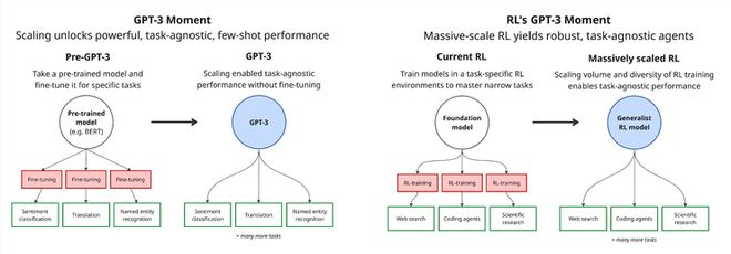我们认为,RL 也将迎来属于它的 “GPT-3 时刻”。这意味着,训练方式将从在少数环境中微调,转向在成千上万种多样化环境中进行大规模训练,以培育出真正具备 few-shot 能力与任务无关泛化能力的智能体,能够灵活应对全新任务。