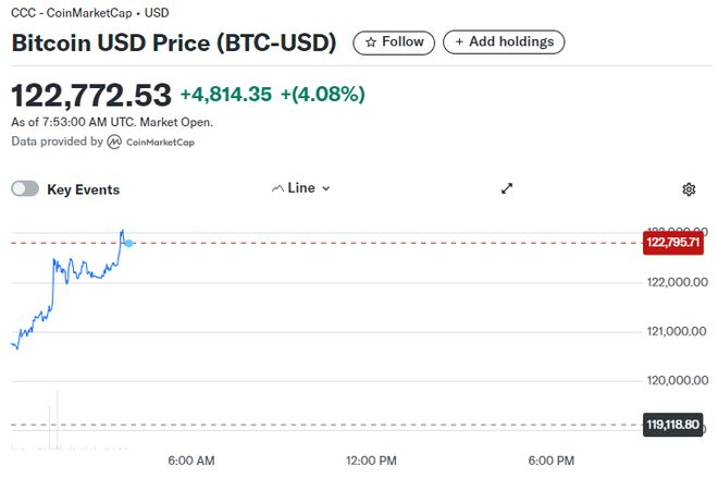 受此消息推动,比特币周一盘中冲高,站上12.3万美元,日内涨幅超4%,再创历史新高。
