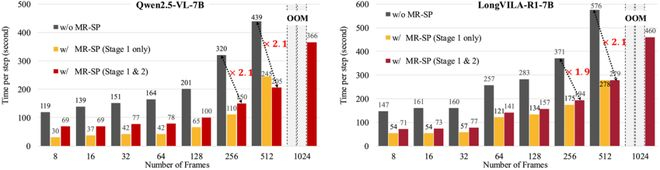 MR-SP的全称是Multi-modal Reinforcement Sequence Parallelism,即多模态强化序列并行,可在不同帧数下显著降低长视频推理的训练耗时和显存:启用 MR-SP 后,训练速度提升可达 2.1×,而传统方案会因显存不足直接 OOM。