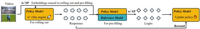 对于每次 rollout,参考模型和策略模型都需要在强化学习中对长视频进行计算密集型预填充。通过复用第 1 阶段收集到的嵌入,可使用序列并行在各个设备之间并行化推理阶段。