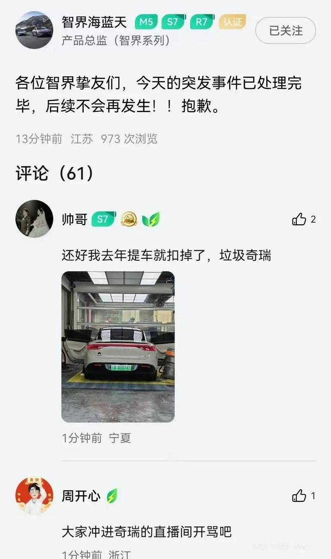 面对来势汹汹的负面评价,智界智行迅速关掉了直播间,智界系列产品总监也连发三条动态道歉:"各位智界的挚友们,今天的突发事件已处理完毕,后续不会再发生!!抱歉。"
