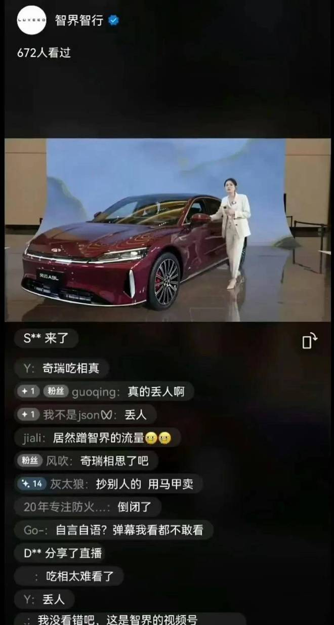 这一举动瞬间让智界的粉丝坐不住了,有网友直接在直播间问道"这是智界,和你风云有啥关系?"还有网友在小红书锐评,奇瑞这波操作,像极了在别人的婚礼上发布征婚广告。更有网友把这场闹剧比作"车企宫心计"。