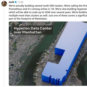 他在社交媒体上发文表示,Meta正在建设多个“吉瓦”级别的数据中心集群,其中包括预计在2026年上线的首个集群“普罗米修斯”(Prometheus),同时另一个名为“海伯里安”(Hyperion)的集群也在建设中,预期将在几年内扩展到5吉瓦规模。作为参考,美国最大核电站沃格特勒核电站,四个机组的发电能力之和约为4.5吉瓦。