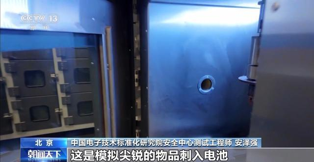 模拟尖锐物品刺入电池的安全风险实验中,记者看到,随着电池表皮被刺破,瞬间火花四溅,电池也很快爆燃。