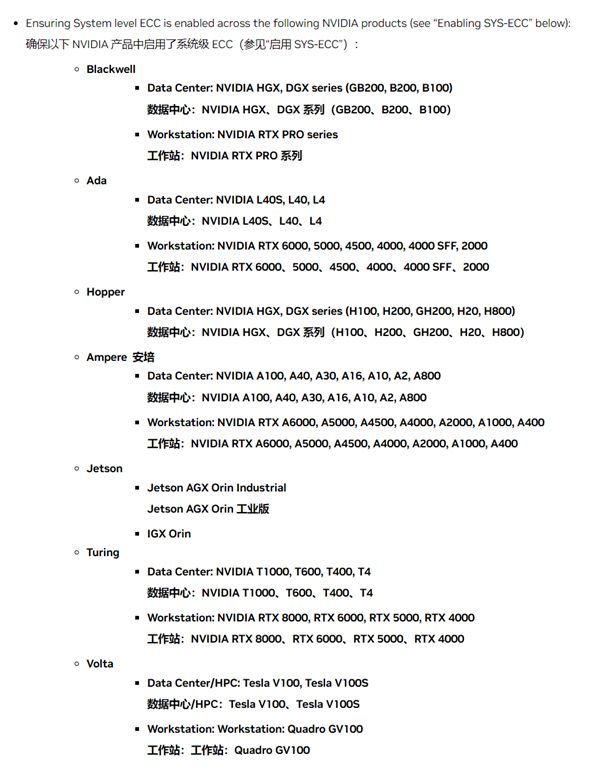 NVIDIA已经发布了受影响型号的完整列表,并建议受影响的显卡启用ECC(错误纠正码)功能来缓解风险,GDDR7和HBM3内置了ECC因此能自动抵御攻击。
