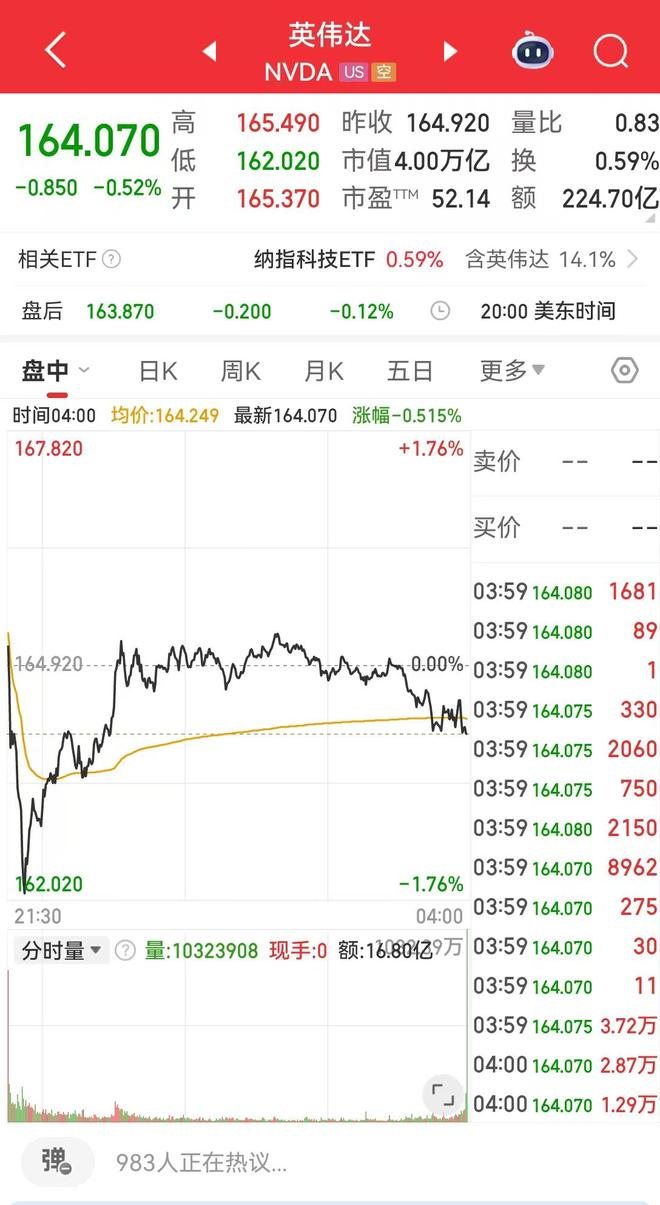 截至当地时间7月14日美股收盘,英伟达报164.07美元,跌幅0.52%。