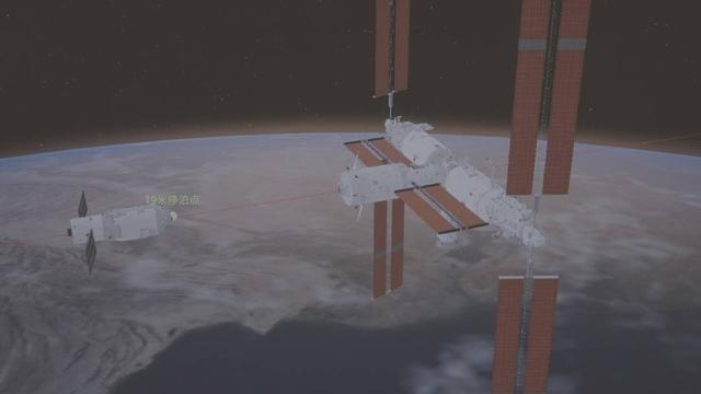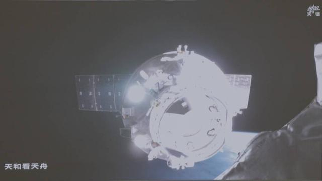7月15日在北京航天飞行控制中心拍摄的天舟九号货运飞船向空间站组合体靠拢的画面。新华社发