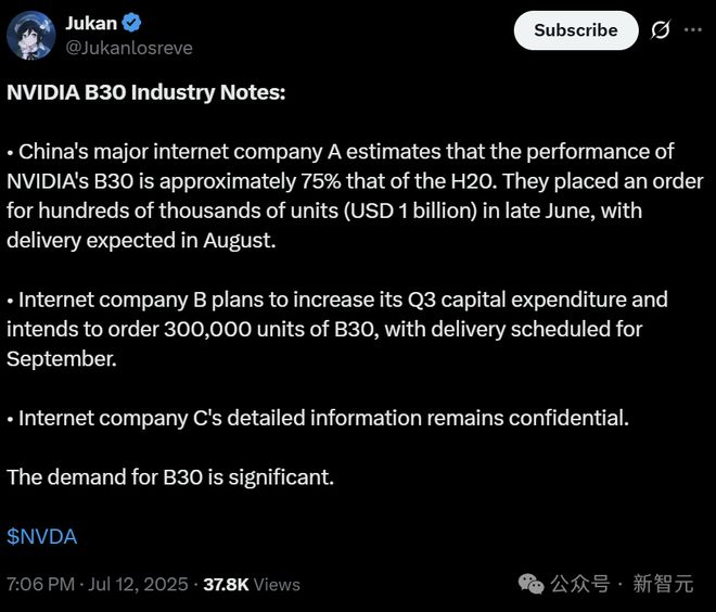 此外,有外媒爆料称,H20还将有一个新的「继任者」——基于Blackwell架构的B30。