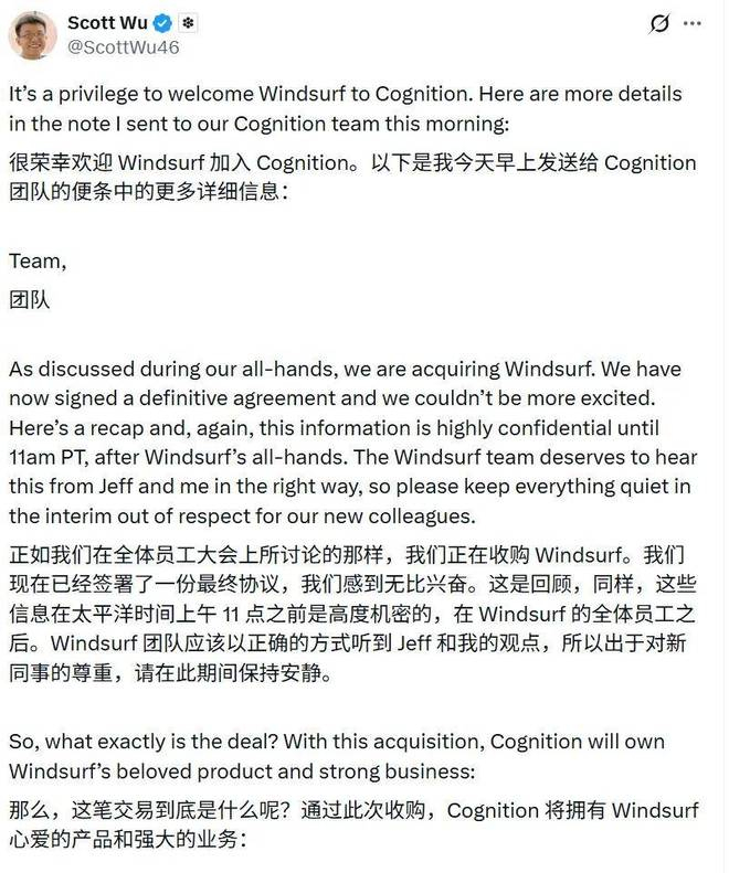 「我们很高兴地宣布,Cognition 已签署最终协议收购 Windsurf。