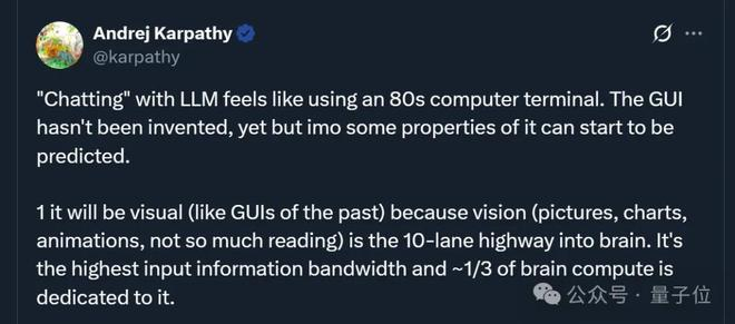 在他看来,如今和大语言模型(LLM)聊天就像在使用80年代的电脑终端,还没有用上图形用户界面(GUI)。