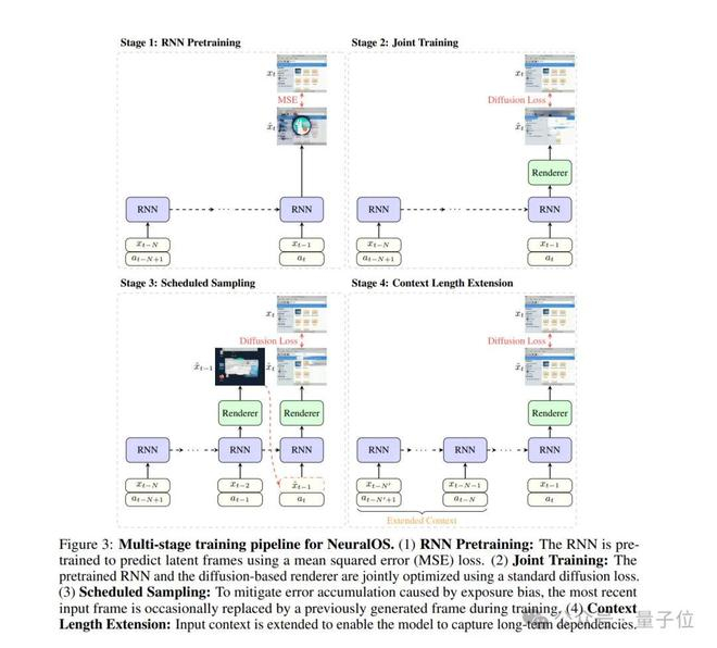 然后经过RNN预训练——RNN+Renderer联合训练——计划采样——将RNN输入的上下文序列加长这一训练流程后,NeuralOS终于学会了根据之前的帧和用户输入(鼠标、键盘)来预测下一帧屏幕图像。