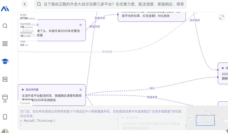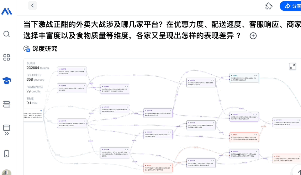 我们搜最近闹得正热的“外卖大战”,不仅能一键获取优惠力度、配送速度等基础信息的直观对比,它还会主动补充诸如 “竞争趋势与战略差异”、“用户行为洞察”等未被提及的深度内容,信息覆盖全面。