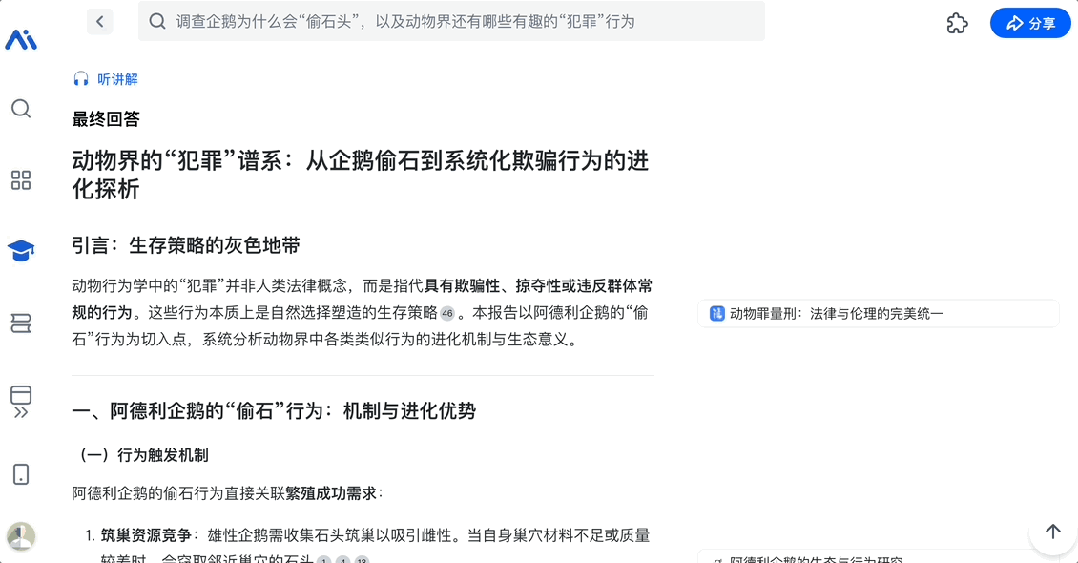 面对“调查企鹅为什么会偷石头,动物界还有哪些有趣的‘犯罪’行为”这种复杂奇怪的问题,它也都能深度理解用户需求,然后帮你研究解答。