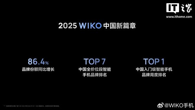 IT之家从 WIKO 官方获悉,WIKO 品牌 2023 年手机销量突破百万台、2025 年份额同比增长 86.4% ,居中国智能手机市场第七名,并一度在入门级档位登顶第一。
