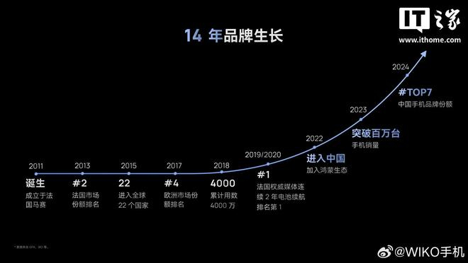 IT之家 7 月 15 日消息,在今天举行的 Hi 畅享80 Pro 手机新品发布会上,WIKO 官方介绍了其品牌由来及发展历程。据称,WIKO 2011 年诞生于法国马赛,曾在法国市场份额排名第二。2022 年进入中国并加入鸿蒙生态,推出 WIKO 了鸿蒙生态手机 Hi 畅享系列。