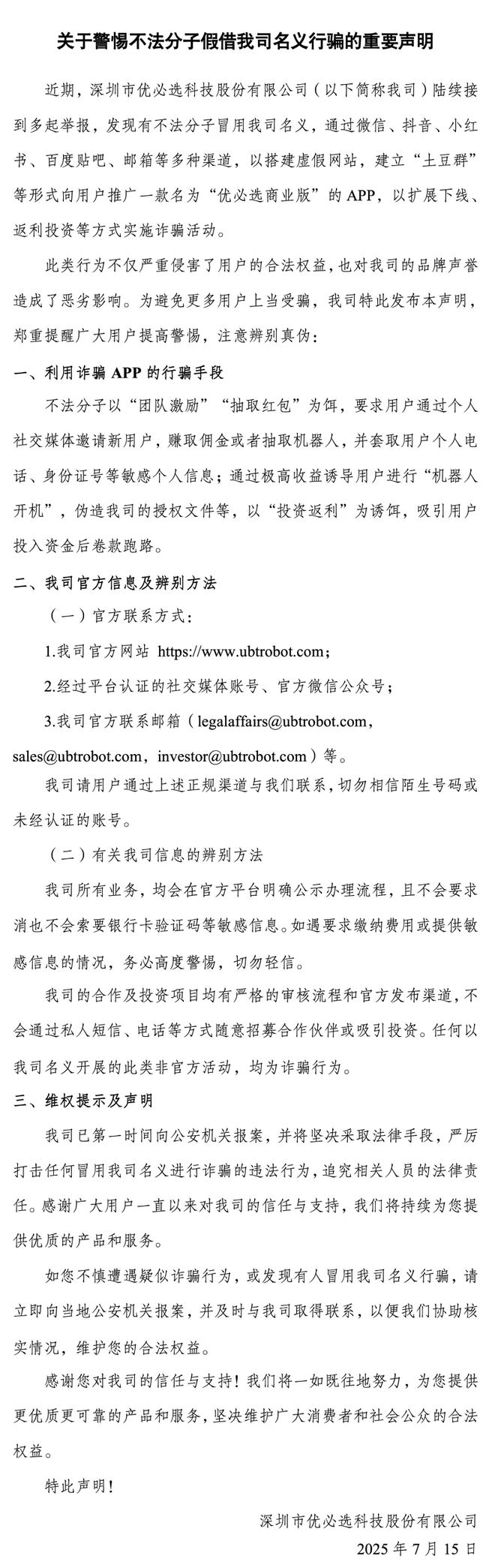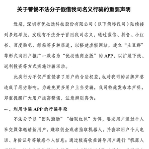 7月15日,优必选发布声明称,近期公司陆续接到多起举报,发现有不法分子冒用公司名义,通过微信、抖音、小红书、百度贴吧、邮箱等多种渠道,以搭建虚假网站,建立“土豆群”等形式向用户推广一款名为“优必选商业版”的APP,以扩展下线、返利投资等方式实施诈骗活动。公司已第一时间向公安机关报案,并将坚决采取法律手段,严厉打击任何冒用公司名义进行诈骗的违法行为,追究相关人员的法律责任。