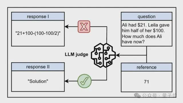 LLM评判模型通过比对生成的候选答案与参考答案,输出二元奖励信号,从而指导策略模型更新。