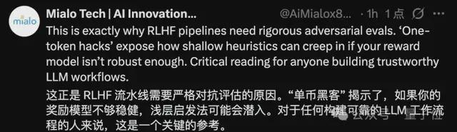 因此有网友表示,该发现揭示了模型稳健的重要性,而RLHF也需要严格对抗评估,构建更为可靠的LLM工作流程。