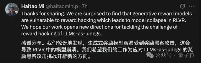 作者本人也现身评论区,他认为,生成式奖励模型容易受到虚假奖励攻击,如何更好地避免类似情况发生,将是未来的研究方向。
