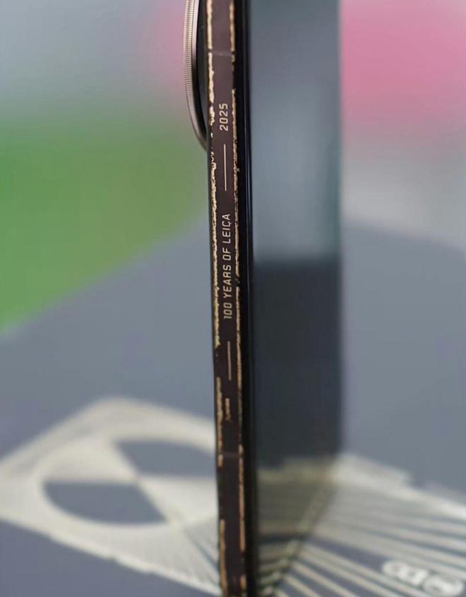手机金属边框上刻有“100 Years of Leica 1925 – 2025”字样,背面同时印有小米 LOGO 和专为此次百年庆典定制的“徕卡 100”标志。