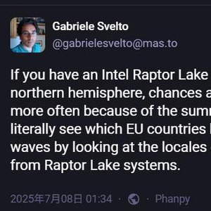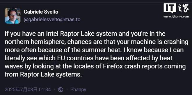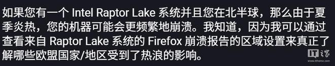 该工程师指出:“如果你用的是搭载了英特尔 Raptor Lake 架构 CPU 的电脑且处于北半球,那么在夏季时你的电脑可能更容易宕机。我是从火狐 Firefox 浏览器的崩溃报告中得知这一现象的,因为很多欧盟 / 美国地区的 Raptor Lake 电脑都受到‘热浪’的影响”。