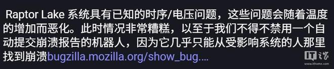 后续有用户询问崩溃的原因,Gabriele 则表示:“Raptor Lake 架构目前已知存在时序 / 电压问题,这些问题在高温时会变得很明显。在我们看来显得十分糟糕,目前出问题且崩溃的人太多,以至于我们得禁用掉一个自动提交崩溃报告的机器人”。