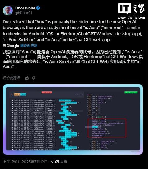 X 用户 @Tibor 在相关代码中发现了“Aura”的提及,这很可能是 OpenAI 新浏览器的内部代号。在 ChatGPT 网络应用中出现了与“Aura”相关的代码片段,例如“is Aura”(类似于检查设备是否为 Android、iOS 或 Electron / ChatGPT Windows 桌面应用的代码),“is Aura Sidebar”以及“in Aura”等标识,这表明“Aura”项目已经进入开发阶段。