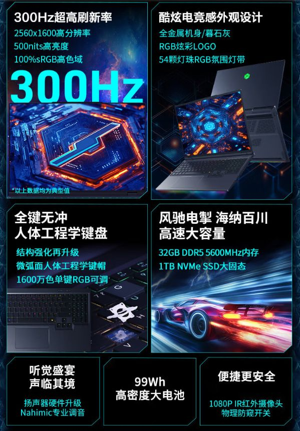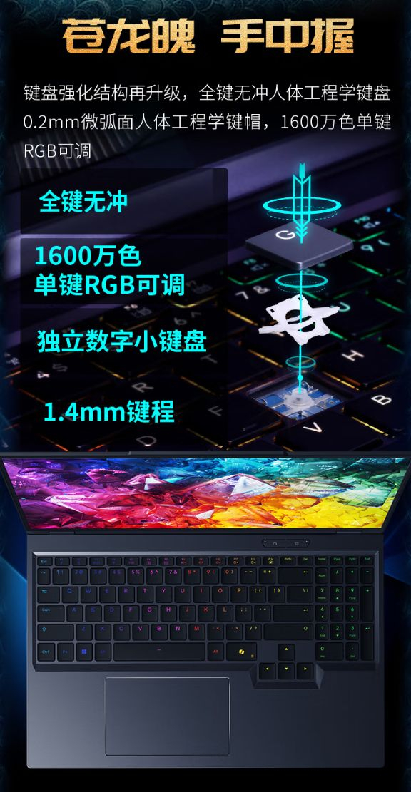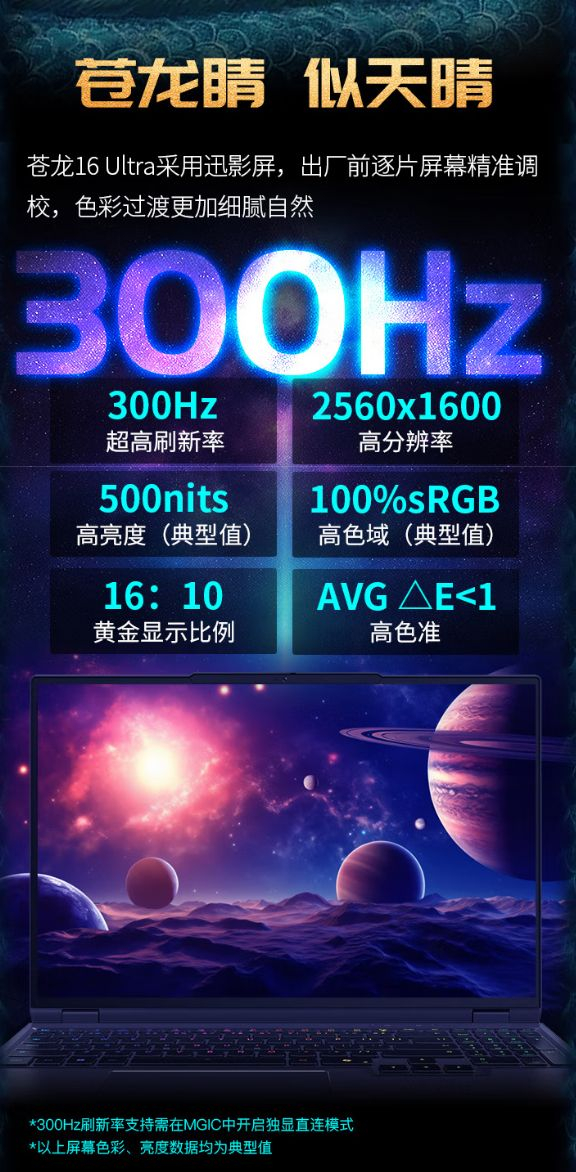 视觉效果上,苍龙 16X 笔记本搭载了一块分辨率为2560*1600、刷新率为300Hz的屏幕,最高亮度可达 500 尼特,色域为 100% sRGB,ΔE<1(IT之家注:用于量化两种颜色之间差异的指标),满足游戏、轻度创作的需求。