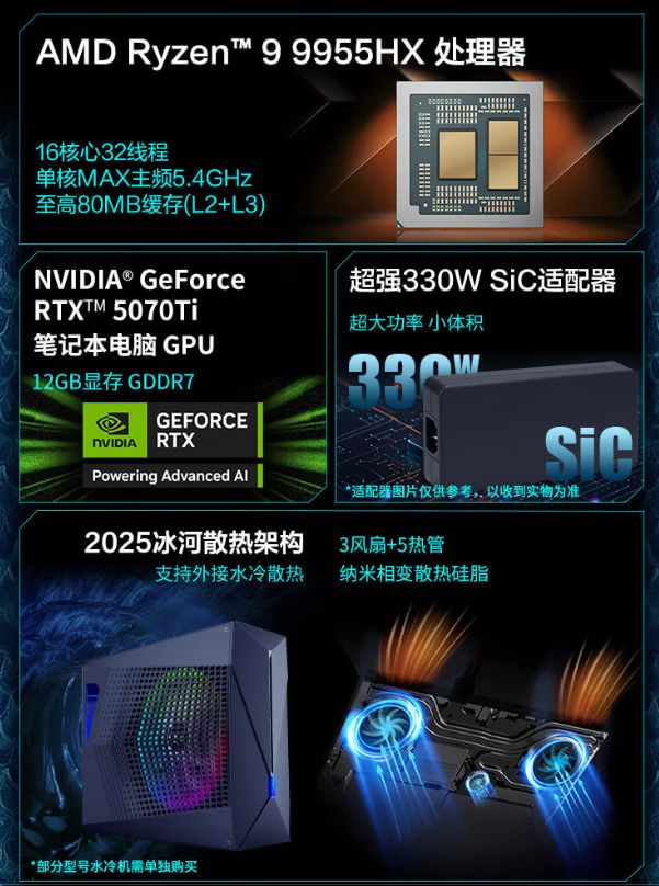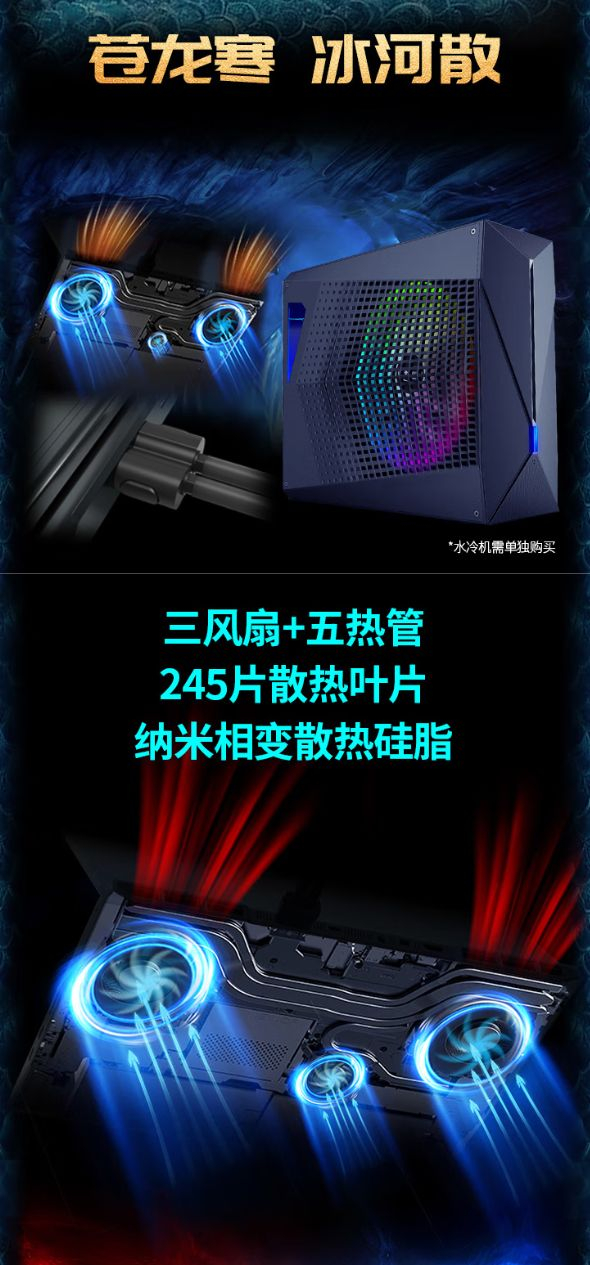 散热方面,该笔记本使用了三风扇 + 五热管的设计,热接触介质为纳米相变片,可选配外置“水冷机”,两者组合使用可带来更好的散热,让游玩体验更加舒适。