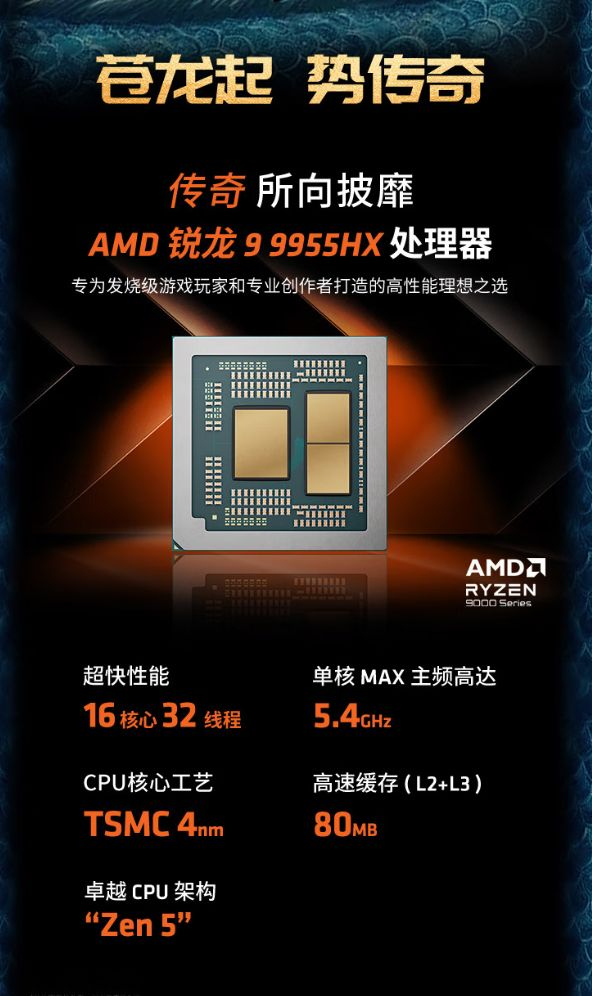 据介绍,该笔记本搭载了 AMD 锐龙 9 9955HX 处理器,其架构为 Zen 5,核心 / 线程数为 16/32,L2+L3 缓存可达 80MB,单核主频最高可达 5.4GHz。
