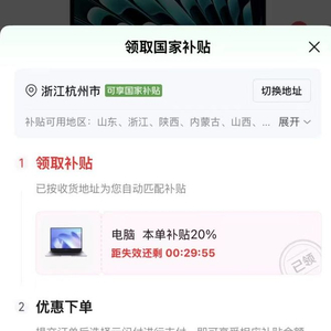 同日,澎湃新闻浏览京东APP发现,将收货地址更改为杭州市后,页面已显示“当前页面无法享受补贴”,补贴可用地区为山东、陕西、上海等地,无浙江等地区。