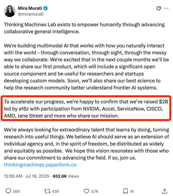 智东西7月16日消息,今日,前OpenAI首席技术官Mira Murati创办的AI公司Thinking Machines Lab(简称TML)宣布完成20亿美元种子轮融资(约合人民币143.46亿元),由a16z领投,NVIDIA、Accel、ServiceNow、CISCO、AMD、Jane Street等参投。